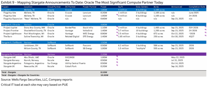 结合 7 月 22 日 OpenAI 宣布和 Oracle 在 Stargate 框架下,新增了第二批规模约 4.5GW 的算力供应协议,即下表中的 Stargate II 中的 4 个项目,市场因此认为这个每年 $300 亿的订单就对应着 Stargate II 项目,并按 5 年的合同期,预期在 F1Q26 时 RPO 会环比新增 $1500 亿上下。