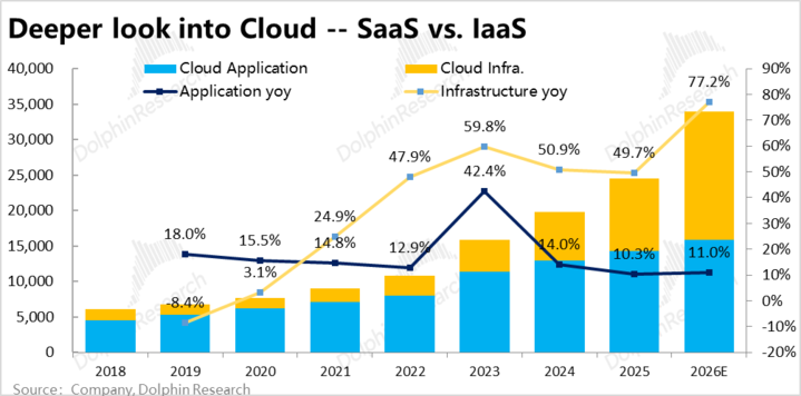 从复盘可以看到,Oracle 原先的传统核心业务--软件已持续衰退多年,云板块中的 SaaS 类业务增长也不算强,近乎完全依赖于 IaaS 这一项业务带动增长。