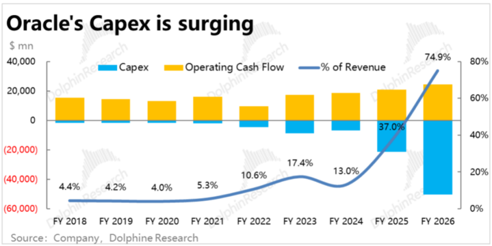 d. 高额 Capex 和负债压力已经不小,且高点还没到:同样和 CoreWeave 的情况类似,大规模新建数据中心给 Oracle 在现金流和负债上带来的压力也是巨大的。
