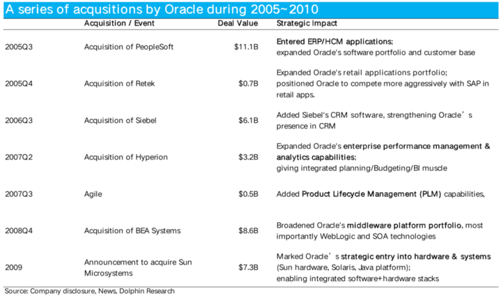 通过这些收购,Oracle 迅速补强了其在企业管理软件上的技术能力和业务规模,成为了当时在该领域内仅次于 SAP 的第二大龙头。
