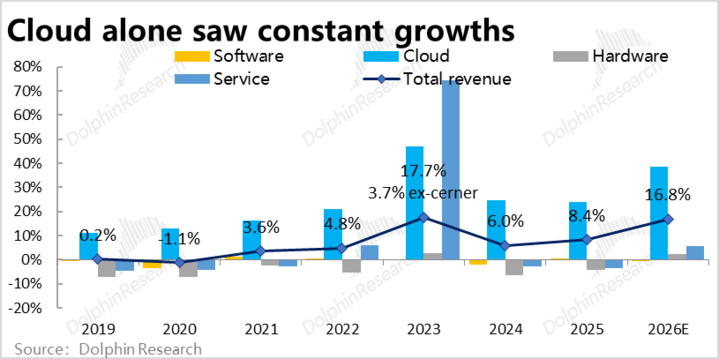 主要的改变是,原先云业务和软件业务是在同一大板块内一同披露,相互有所交叉。本次把云板块单纯拆出来——更清晰的分为云业务 (Cloud),软件 (Software),硬件 (Hardware) 和服务 (Service) 四大板块,以便市场能更清晰的跟踪其云业务的发展。
