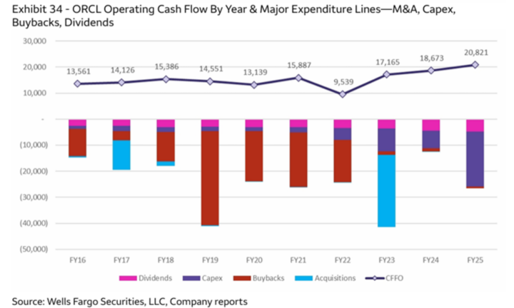 近十多年来 Oracle 一直采取 「举债经营」 的理念。由下图可见,16 财年以来公司的现金支出就几乎每年都高于经营现金流,早年间主要用于巨量的回购和对外收购,未来则将主要用在 Capex 上。