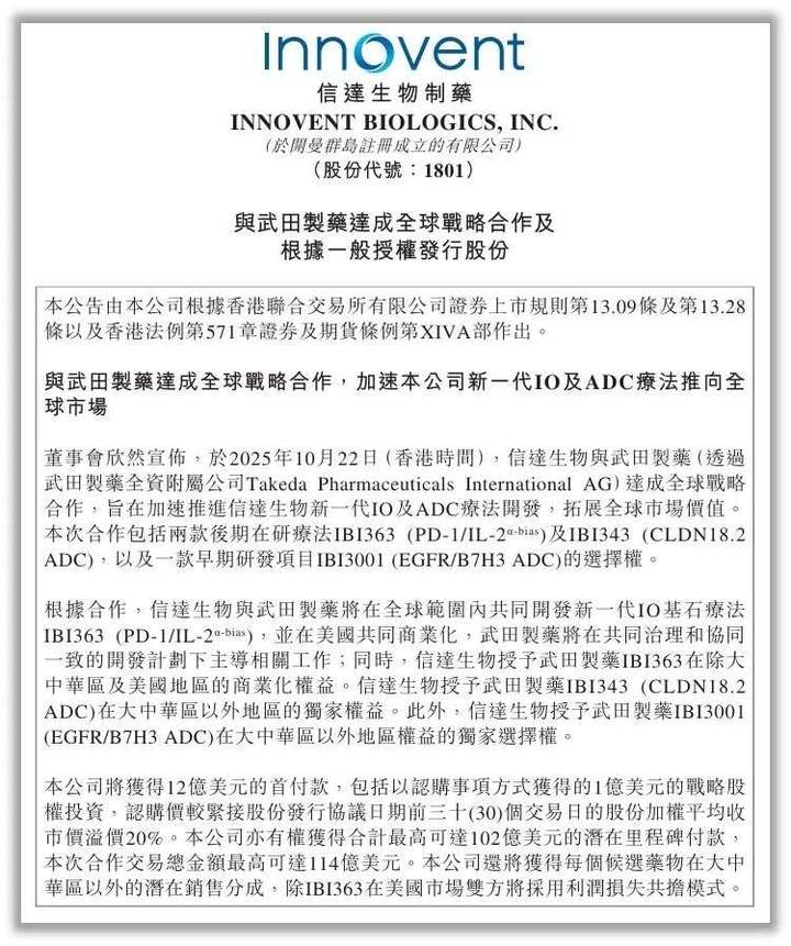 2025 年 10 月,信达生物宣布与日本知名药企——武田制药达成全球战略合作,交易总金额最高至 114 亿美元,包括 1 亿美元的溢价战略股权投资。