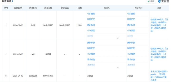 根据天眼查的信息,百川上一轮融资停在 2024 年 7 月,拿了 50 亿,估值 200 亿。之后就没再有公开的融资消息。