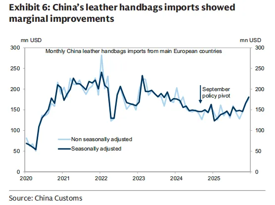 高盛的研究团队在实地走访中发现,近几个月来,国内主要高端购物中心 SKP、万象城的奢侈品零售展现出了明显的恢复势头。从宏观海关数据中也能找到印证,来自欧洲主要国家的皮包进口量在近期出现了显著的环比增长,这种边际改善直接反映了高净值人群的信心回归。