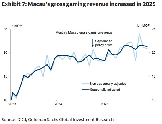这种局部的火热还蔓延到了服务消费领域,比如 2025 年第四季度澳门的博彩总收入 (GGR) 表现就超出了市场预期,这与小 Z 那种“ 账户红了就去换车” 的心理异曲同工,都是由一部分率先获利的群体所驱动的。