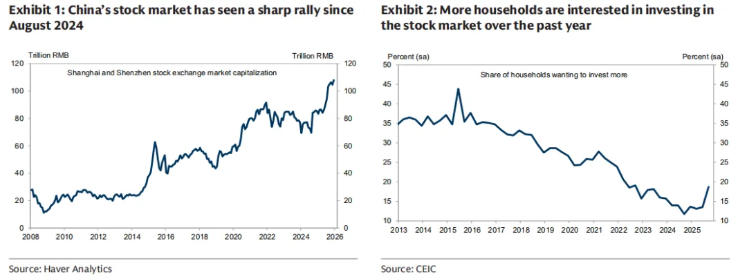 这种体感在宏观数据上也得到了印证。据高盛最新发布的报告显示,A 股自 2024 年 8 月的低谷以来,截至去年年底,总市值已经累计上涨了 55%。随着账户数字的跳动,居民的投资意愿也顺势爬升到了 2022 年第三季度以来的最高点。