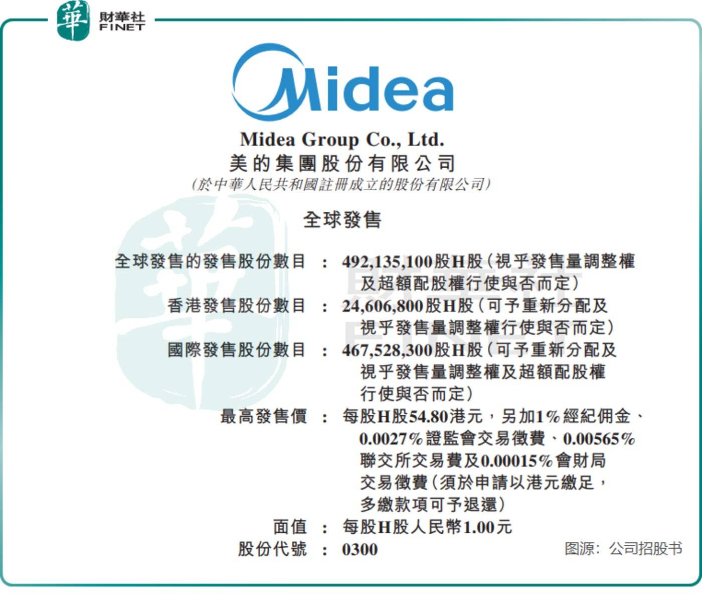 根据招股书,美的集团计划全球发售 4.92 亿股 H 股,每股发售价介于 52.00 港元至 54.80 港元之间,计划募资总额为 255.89 亿港元至 269.67 亿港元。