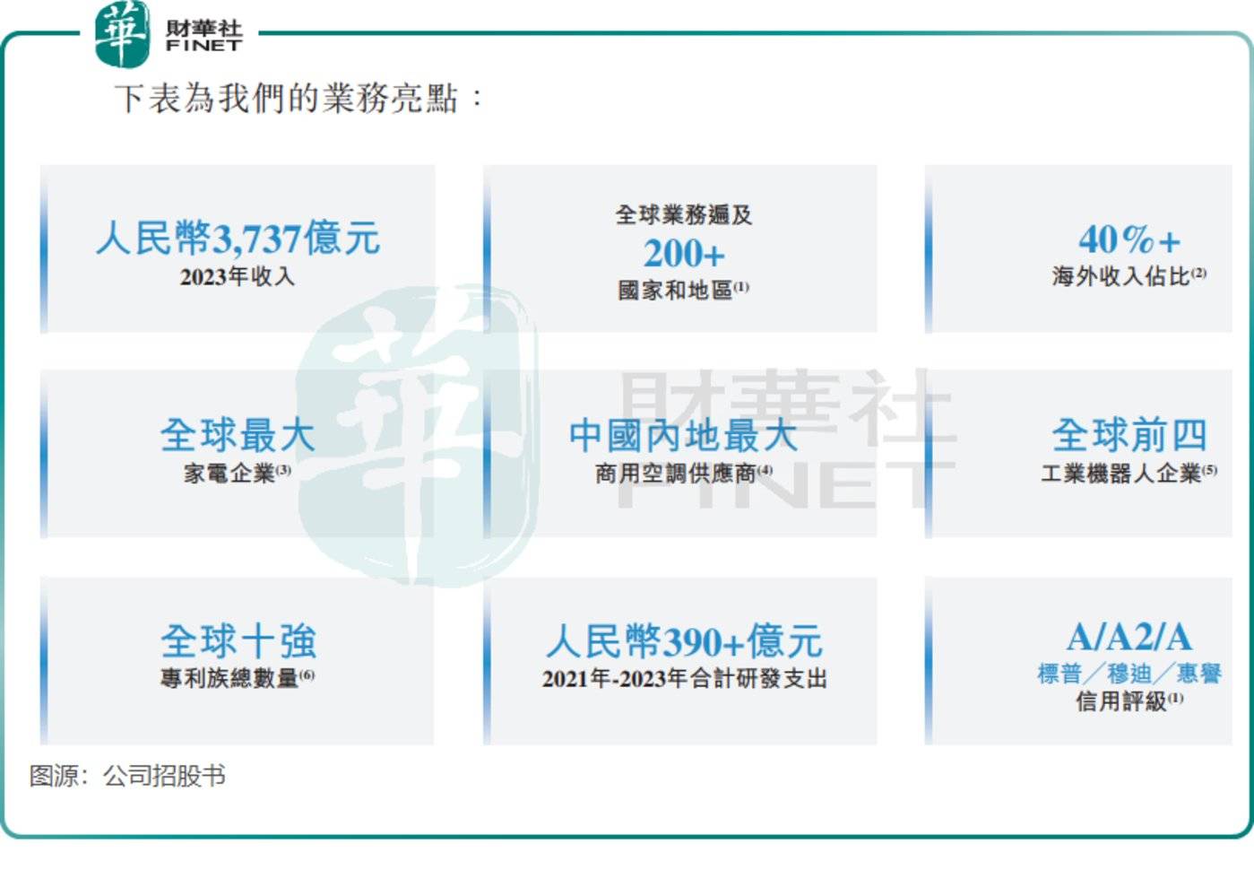 按照 2023 年销量及收入计,美的集团是全球最大的家电企业,按销量计市场份额为 7.9%。于 2023 年,按销量计,美的集团在家用空调、洗衣机、冰箱以及厨电及其他家电领域均跻身全球前三名。此外,美的集团旗下的库卡集团是全球四大工业机器人企业之一,2023 年重载机器人销量和收入排名第二。