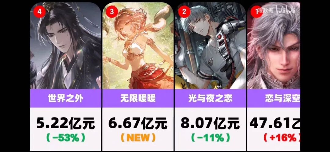 而且从流水来看,《光与夜之恋》 能够跻身后四大绝不是充数,根据统计,2025 年女性向游戏全年流水榜单,第一名是 《恋与深空》 以 47.61 亿的绝对性优势成为当之无愧的榜首,而第二名就是 《光与夜之恋》,年流水 8.07 亿,甚至超过了 2024 年年底才上线的新游 《无限暖暖》。