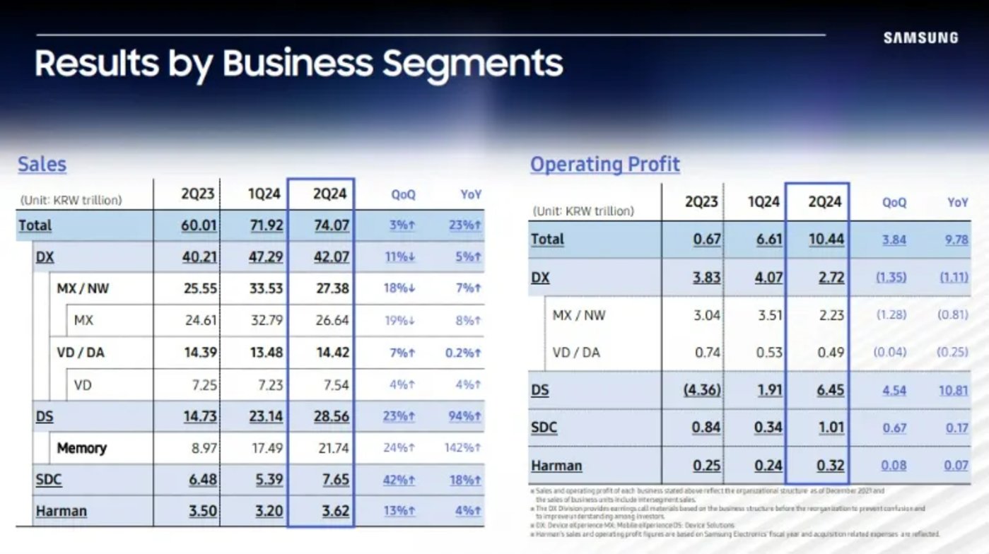 我们拿三星最新的 2024Q2 财报来看,负责半导体的 DS 部门销售额 28.56 万亿韩元,利润 6.45 万亿韩元,利润贡献率达 61.8%。