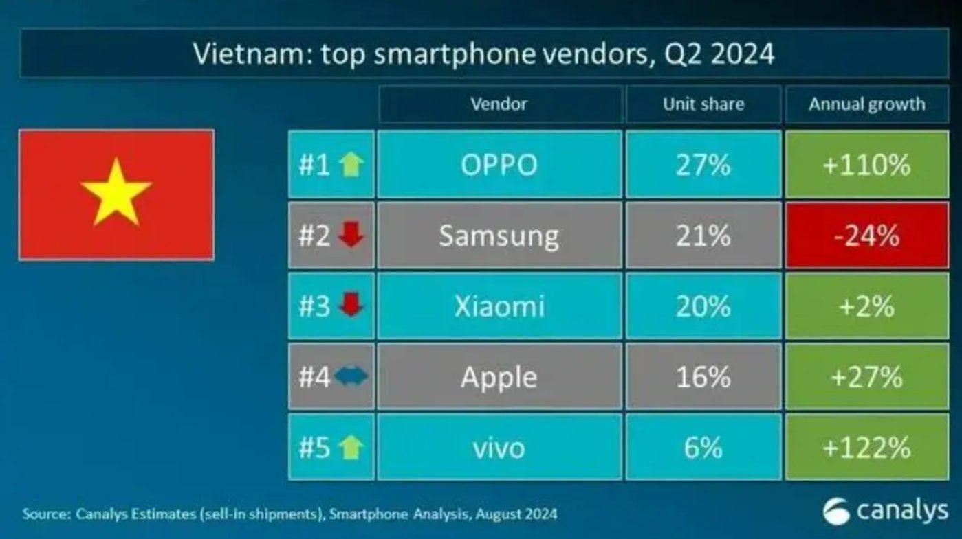 现在即便在国外,三星手机也遭受到了中国品牌的极大挑战。今年 Q2,三星在大本营越南的手机市场份额也被 OPPO 超过了,小米紧随其后。