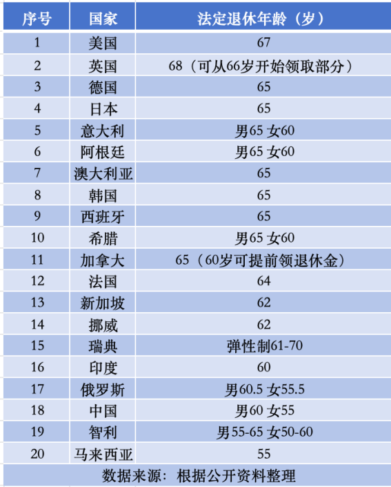 从世界各国实施延迟退休政策来看,延迟法定退休年龄是世界性趋势。全国人大代表孙维表示,世界许多老龄化国家都在推动延迟退休。美国、德国提出将退休年龄从 65 岁延迟到 67 岁,新加坡提出将退休年龄从 62 岁延迟到 65 岁,英国提出将退休年龄从男 65 岁、女 60 岁统一延迟到 68 岁。全球老龄化程度最高的日本,提出将退休年龄从 65 岁延迟到 70 岁。