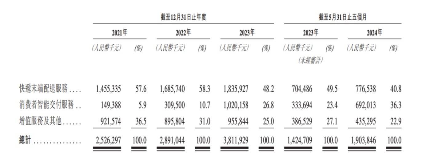 另一项快速增长的业务是消费者智能交付服务。这项业务在 2021 年~2023 年分别录得营收 1.49 亿元、3.1 亿元、10.2 亿元,2024 年前五个月录得营收 6.92 亿元,营收占比分别为 5.9%、10.7%、26.8% 以及 36.3%。