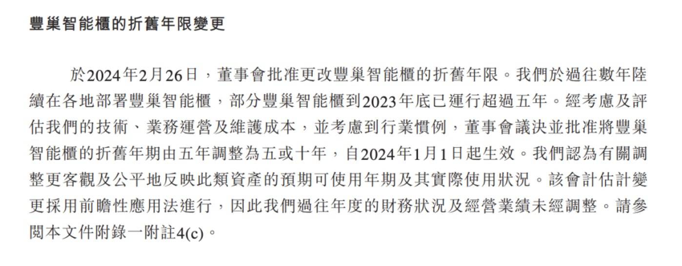 一刻商业注意到,这部分成本的降低,源于丰巢智能柜的折旧年限得到重新认定——由于部分丰巢智能柜运营 5 年后依旧可以使用,丰巢将智能柜折旧年限由 5 年调整到 10 年,并将成本变动计入 2024 年后的财务报表中。