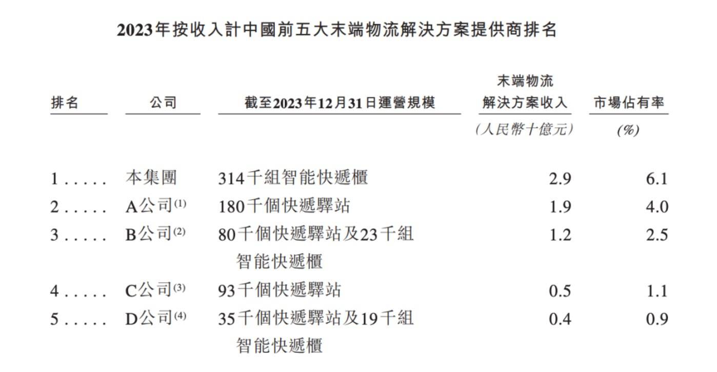 尽管包裹处理量差距很大,在末端物流解决方案行业上,2023 年丰巢却以 29 亿元营收超过菜鸟 2023 财年 (2022 年 3 月~2023 年 3 月) 的 19 亿元。据灼识咨询数据,2023 年丰巢行业市占率为 6.1%,菜鸟市占率为 4%。
