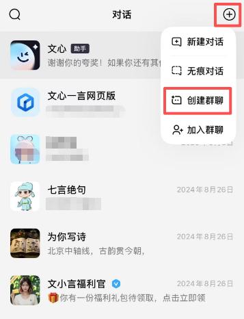 具体使用方法:打开文心 APP,点击右上角➕符号,创建群聊。