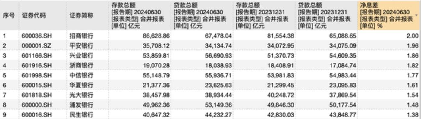 9 家股份行上半年存贷款及息差数据,源自 wind