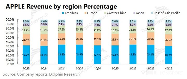 5、分地区收入:其中美洲地区依然是公司基本盘,收入占比维持在 4 成以上,本季度实现 11.2% 的同比增长;大中华区是本季度表现最好的地区,在 「加量不加价」 的政策之下,iPhone17 256G 新机也能享受国补政策,直接带动 iPhone 在中国大陆地区本季度销量同比增长 20%。
