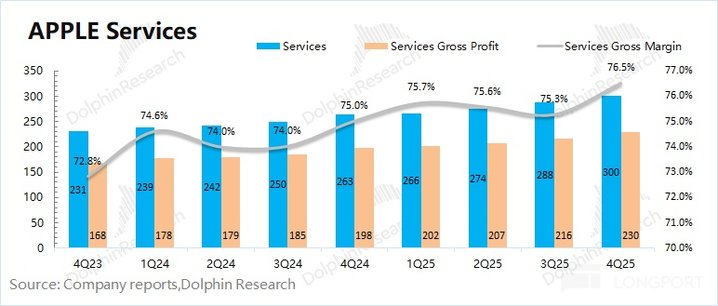 2026 财年第一季度 (即 4Q25) 软件服务收入 300 亿美元,同比增长 13%,符合市场一致预期 (300 亿美元)。即使在美国 App Store 允许外部链接的情况下,苹果软件服务收入依然维持着两位数的增长,体现了苹果软件生态的壁垒。