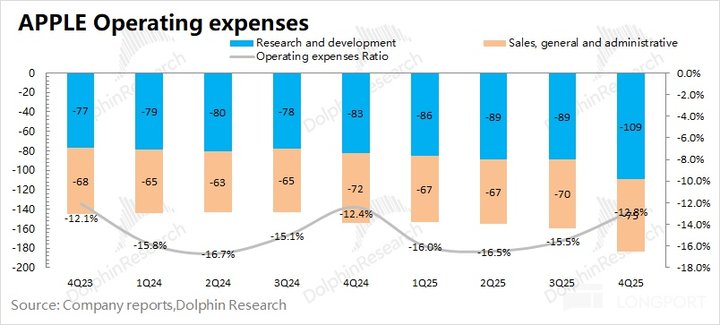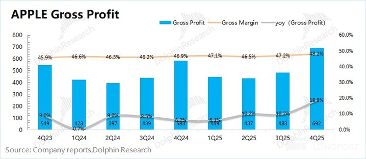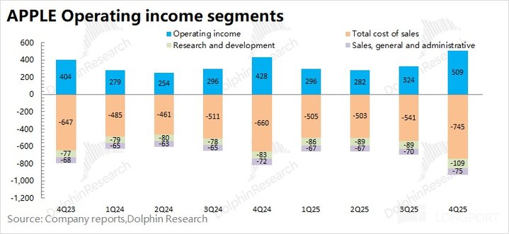 1.3 经营利润:2026 财年第一季度 (即 4Q25) 苹果公司经营利润 509 亿美元,同比增长 18.7%。苹果公司本季度经营利润的增长,是受收入增长和毛利率提升的共同带动。