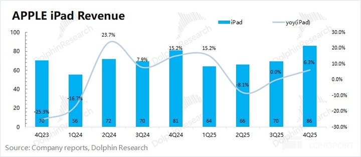 2026 财年第一季度 (即 4Q25)iPad 业务收入 86 亿美元,同比增长 6.3%,略好于市场一致预期 (82 亿美元),主要得益于 M5 Pro、A16 机型增长的带动。