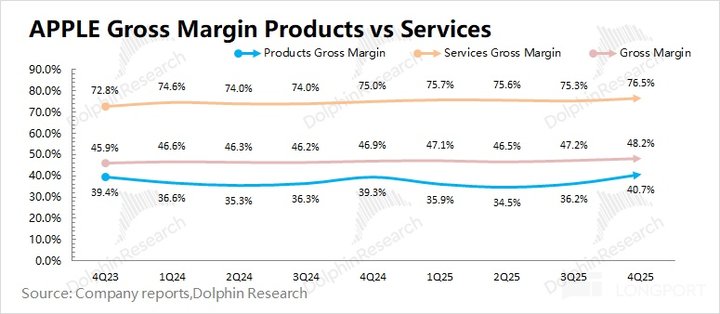 1.2 毛利率:2026 财年第一季度 (即 4Q25) 苹果公司毛利率 48.2%,同比提速 1.3 pct,好于市场一致预期 (47.5%)。公司毛利率的提升,主要是受硬件业务毛利率和软件业务的双重拉动。