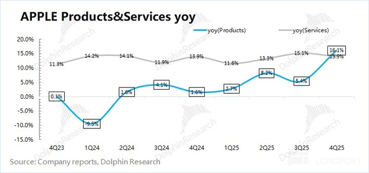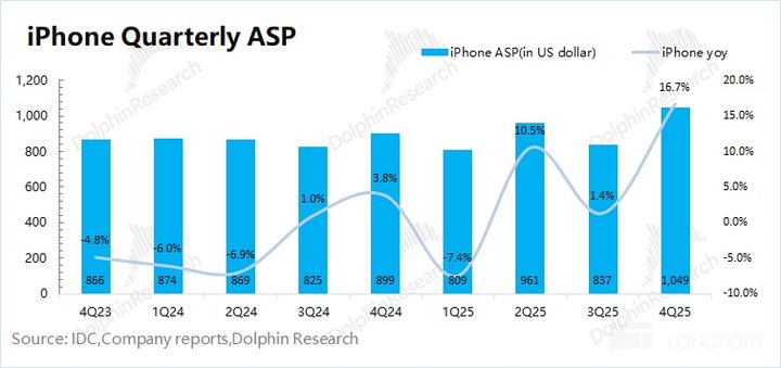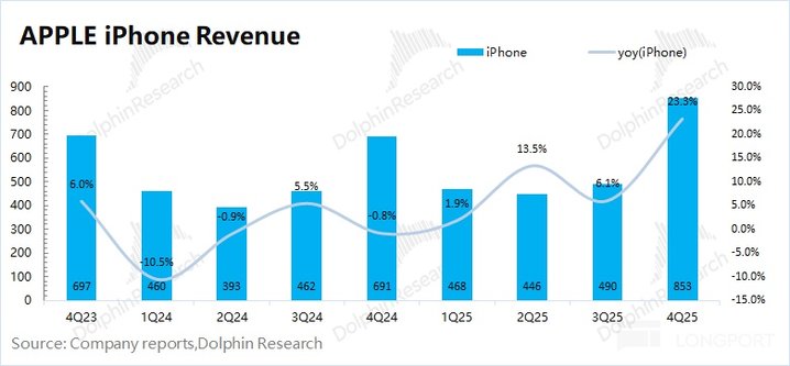 2、iPhone:苹果本季度 iPhone 业务实现营收 853 亿美元,同比增长 23.3%,远好于市场预期 (782 亿美元)。本季度手机业务的增长,受 iPhone17 系列新品和美元贬值的影响。对于本季度,海豚君估算 iPhone 整体出货量同比增长 5.7%,出货均价同比上涨 16.7%。