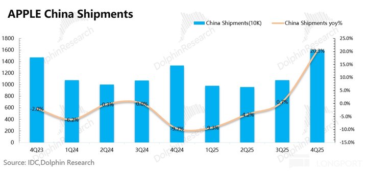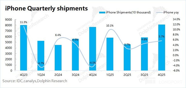 1)iPhone 出货量:根据 IDC 的数据,2025 年第四季度全球智能手机市场同比增长 1.4%。苹果本季度全球出货量同比增长 5.7% 左右,公司的出货量表现好于整体市场。