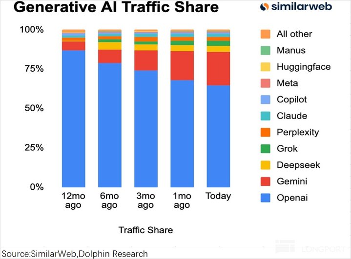 至于为什么选择 Gemini 呢?一方面是苹果和谷歌本身就有每年超 200 亿美元的搜索合作;另一方面 Gemini 的市场份额呈现明显上升的态势,至今已经突破两成。