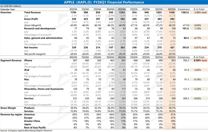 1.1 收入端:2026 财年第一季度 (即 4Q25) 苹果公司实现营收 1438 亿美元,同比增长 15.7%,好于市场预期 (1383 亿美元)。公司本季度收入端的提升,主要受益于 iPhone、iPad 和软件服务业务增长的带动,而 Mac 和可穿戴等其他硬件业务表现有所下滑。