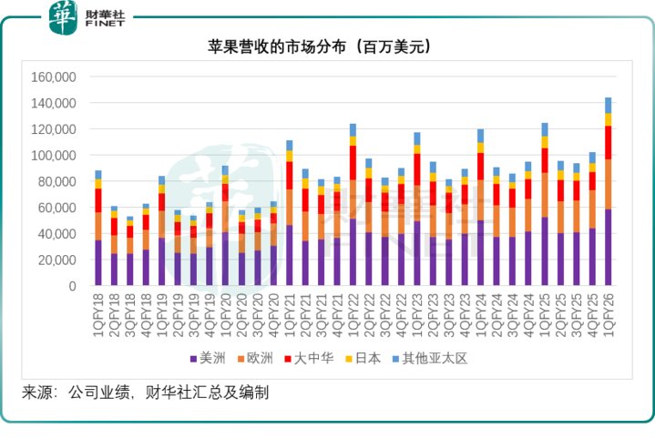 与营收、盈利同步增长的是苹果全球市场的全面开花。库克在财报电话会上表示,12 月财季苹果在美洲、欧洲、日本及亚太其他地区均创下历史营收纪录,在其追踪的大多数市场中实现增长,新兴市场与成熟市场齐头并进,展现出全域增长的强劲韧性。