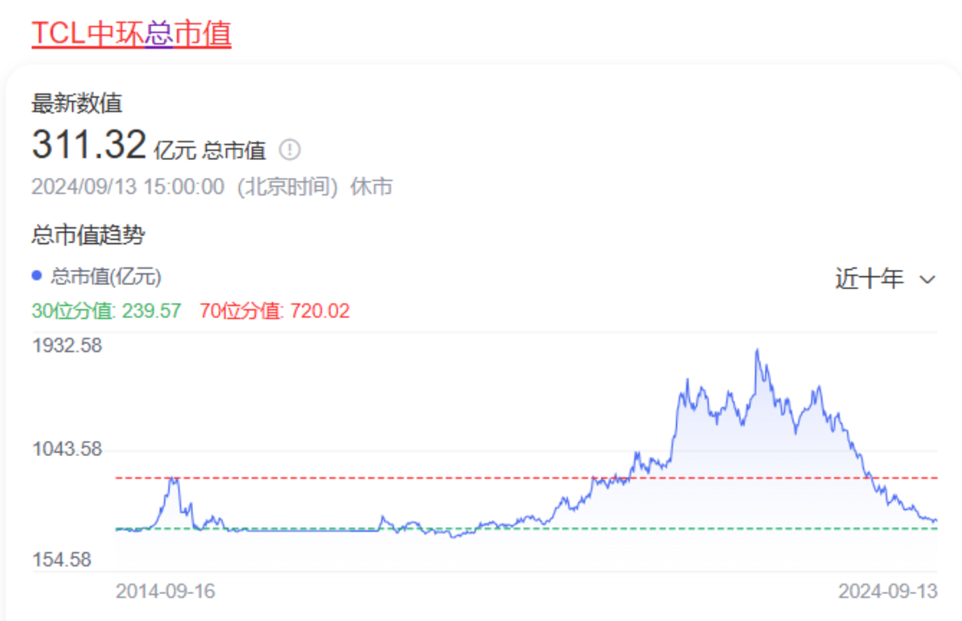 高打高举,丢利润提高市场份额的举动也没有获得资本市场的认可,TCL 中环市值从 2022 年 7 月 3 日的 1912 亿元下跌到目前的 317 亿元,跌幅达到 83%。