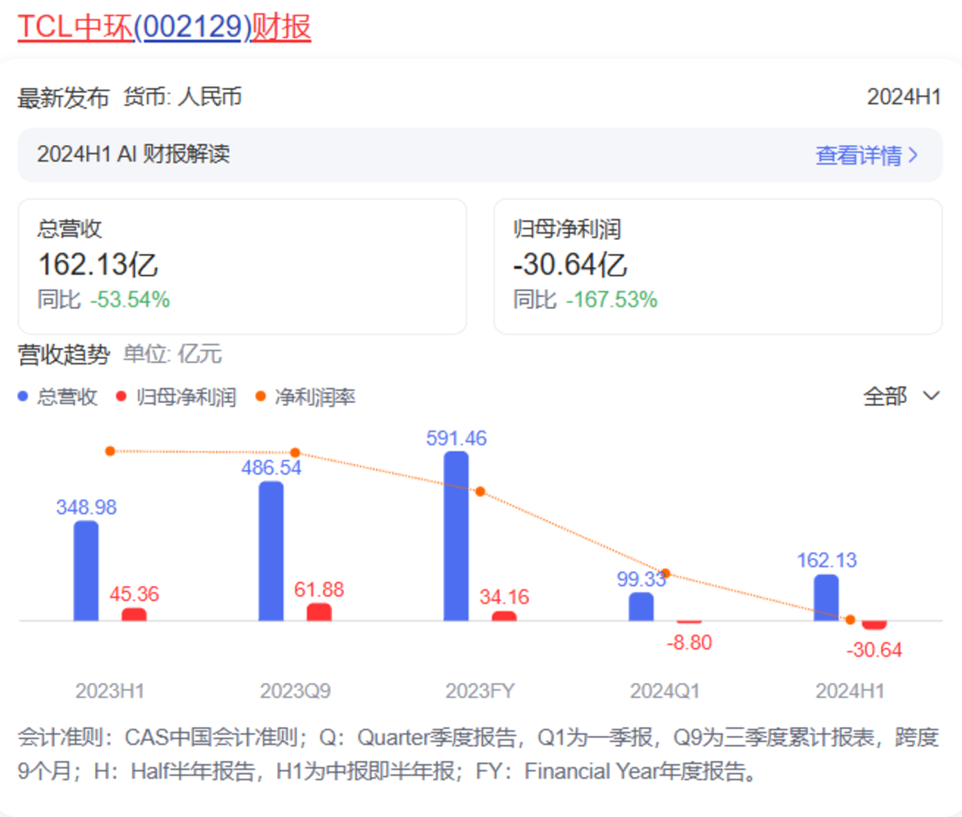 日前,TCL 中环发布财报显示:2024 年上半年,TCL 中环营收为 162.13 亿元,同比下降 53.54%,归母净利润为-30.64 亿元,同比下降 167.53%。