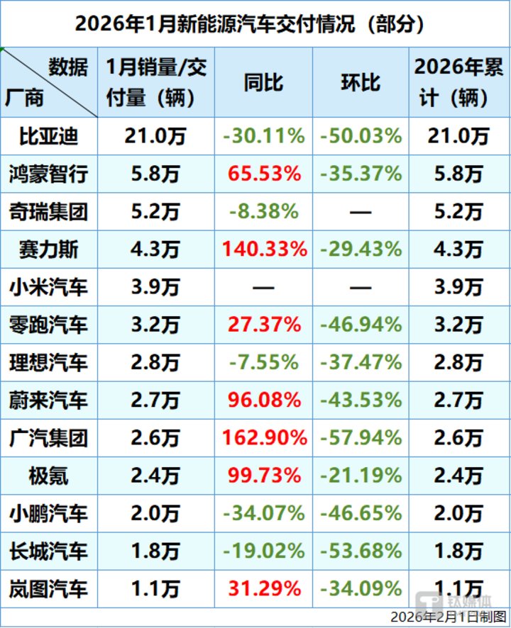 2 月 1 日消息,车企公布今年 1 月新能源汽车的交付情况,6 家交付量超 3 万,5 家同比增超 50%。其中,比亚迪交付 21.0 万,同比下降 30.11%,环比下降 50.03%;鸿蒙智行交付 5.8 万,同比增长 65.53%,环比下降 35.37%;奇瑞集团新能源销量 5.2 万,同比下降 8.38%;赛力斯销量 4.3 万,同比增长 140.33%,环比下降 29.43%;零跑交付 3.2 万,同比增长 27.37%,环比下降 46.94%;理想交付 2.8 万辆,同比下降 7.55%,环比下降 37.47%;小鹏交付 2.0 万,同比下降 34.07%,环比下降 46.65%;小米交付超 3.9 万辆。