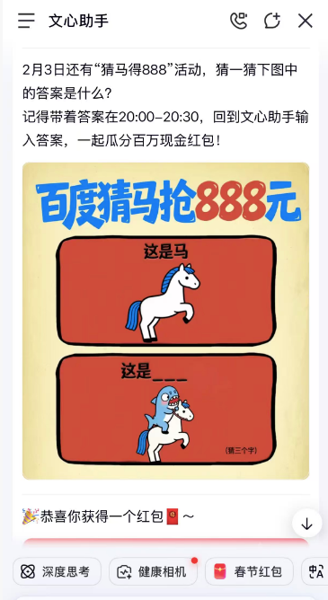 一位百度内部人士解释:「我们希望通过春节活动,让用户在使用红包的同时,也能体验到文心助手的强大功能。」