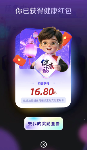 用户从支付宝集福会场领取 「健康福」 后,可额外获得一个健康红包,实时到账,线下场景用支付宝支付即可使用,7 天内有效。