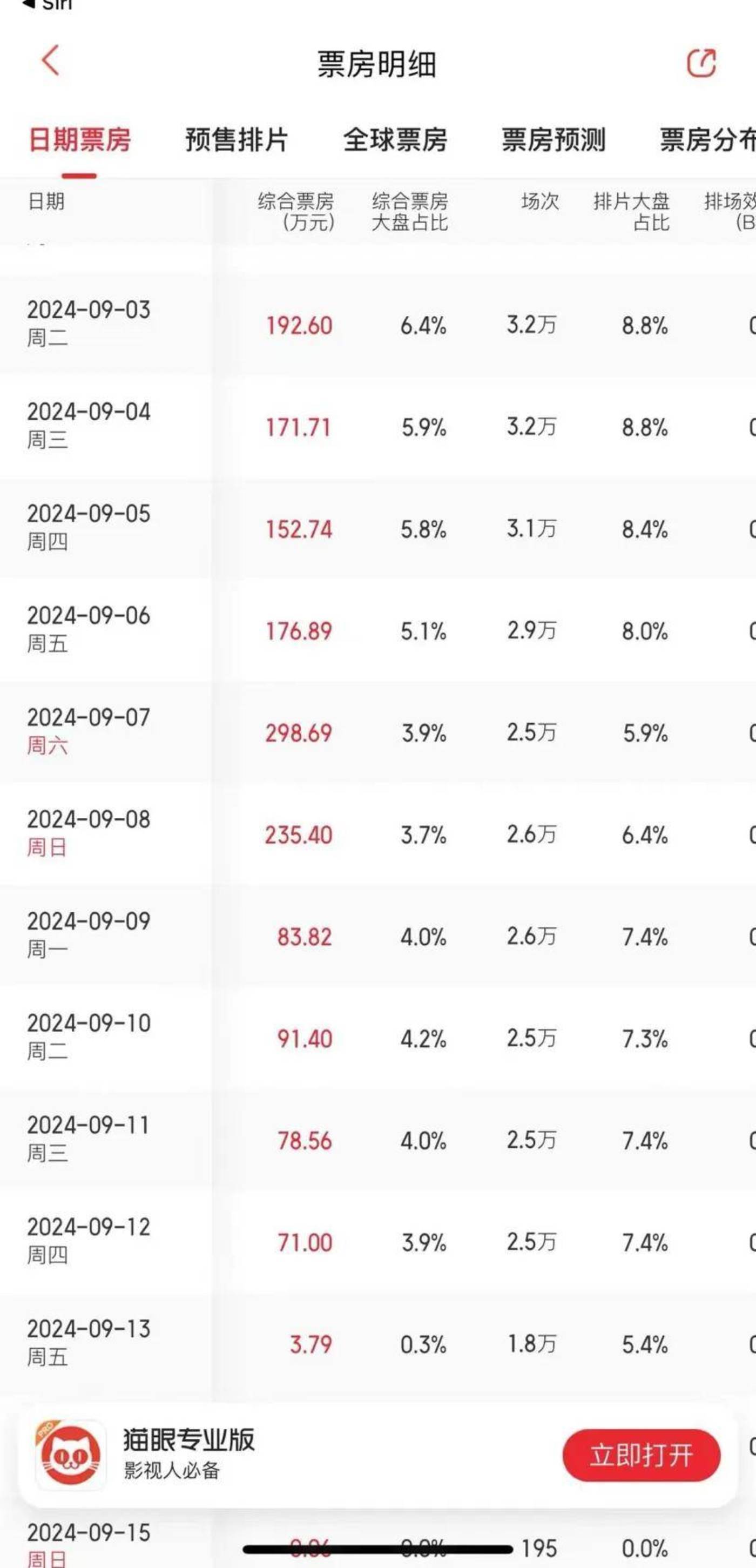 中秋国庆档正接棒冷清的暑期档,截至 9 月 15 日下午 2 点,中秋档票房刚突破 1 亿。