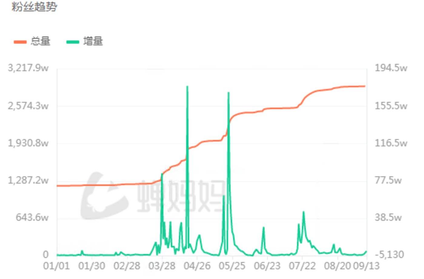 观察周鸿祎的涨粉曲线,可以清晰地发现,他在年初、4 月分别有两个大波峰,3 月有一个小波峰,但从 5 月开始,他的粉丝增长逐步增长乏力。