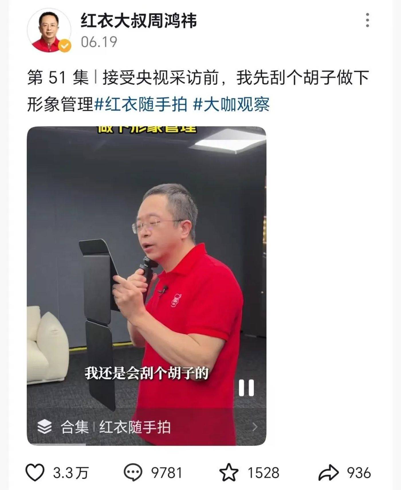 当然,周鸿祎也有修边幅的时候。比如今年 6 月,在接受央视采访前,周鸿祎专门刮了胡子,还拍了一段视频。