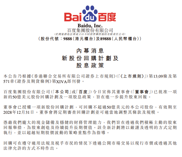 百度集团公司表示,此举依托于其强大的现金储备与稳健的财务管理能力,旨在通过清晰的回报框架,平衡股东回报与公司长期战略增长。
