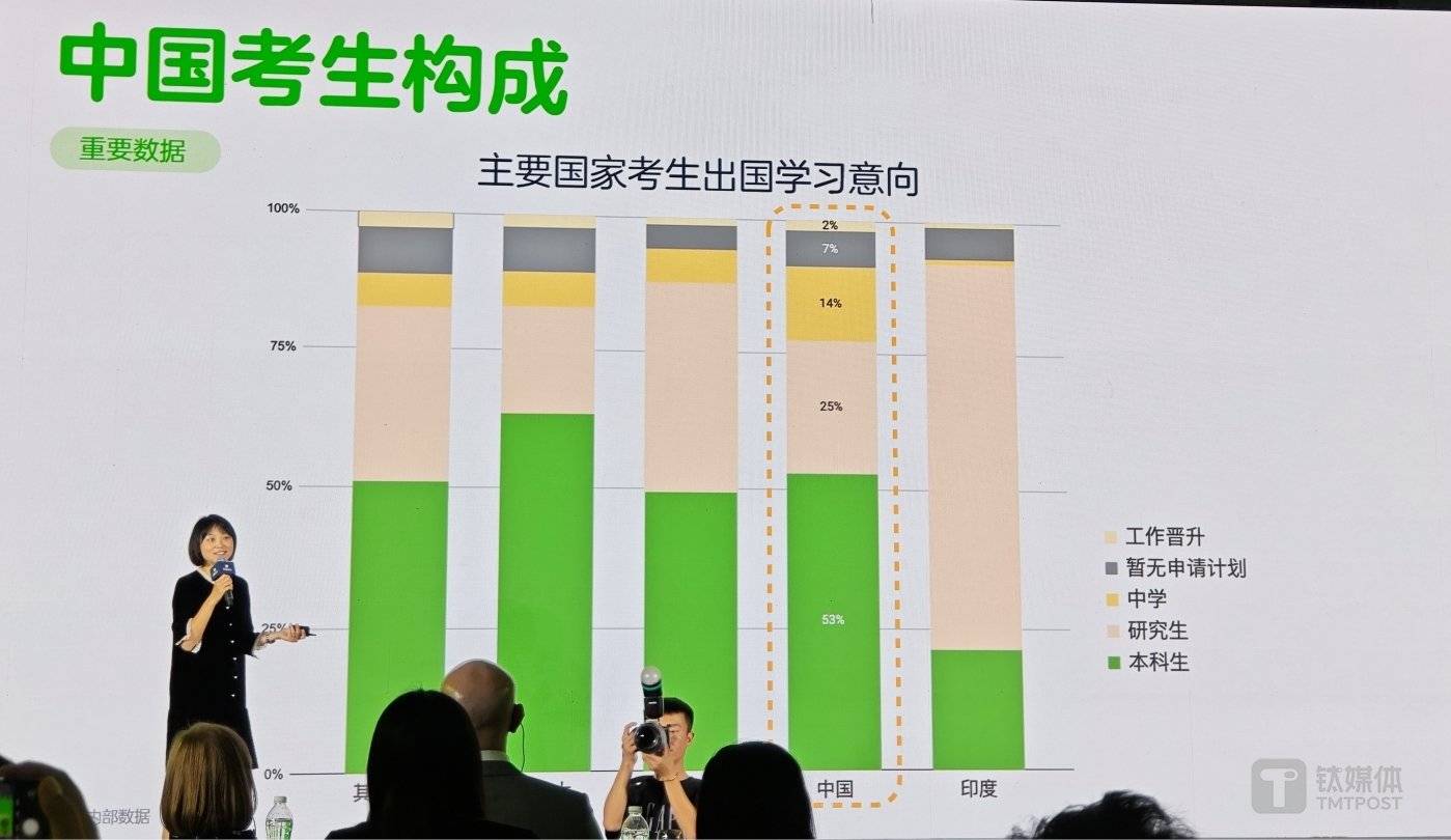 「为了拓展中国市场,我们一直都坚持中国优先战略,主要集中三个方面:一是我们永远把考生放在第一位,通过产品和服务创新提供更好更优质的体验;二是不断打造 DET 在国内的品牌影响力;三是需要跟行业和生态伙伴携手深耕,触达到每一个留学的考生群体。」 王琛在演讲中指出,尽管国内面临市场竞争,但中国拥有极大的留学市场潜在机遇。目前在美国,约 53% 的国际学生来自中国和印度;同时,中国整体留学市场中,有高达 53% 的考生会考虑申请本科项目,14% 会选择出国读中学;此外在 DET 考试中,中国考生平均考试 2.1 次,为全球最高。