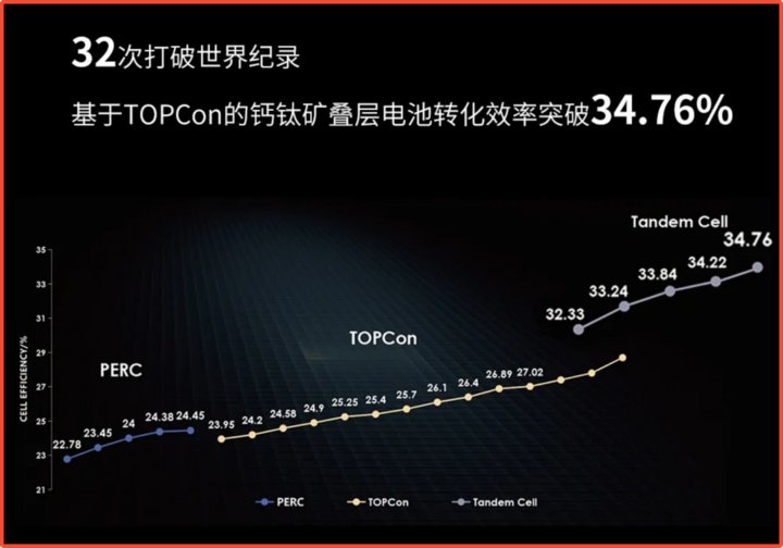 晶科能源当前 TOPCon/钙钛矿叠层电池可实现 34.76% 的转化效率和行业领先的可靠性表现。它在最近一次机构调研中表示,钙钛矿在一定照射条件下具备一定的自修复特性。在效率上,钙钛矿和晶硅的叠层能够起到 1+1>2 的效果。