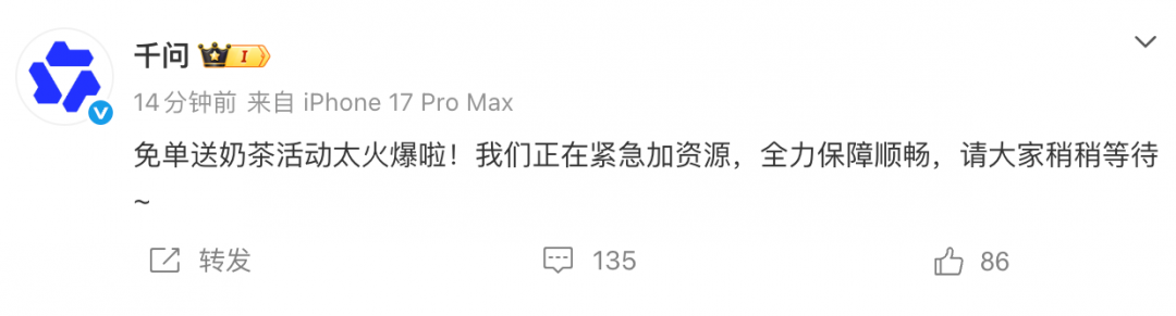 对此,千问官微发文回应称,「免单送奶茶活动太火爆啦!我们正在紧急加资源,全力保障顺畅,请大家稍稍等待。」