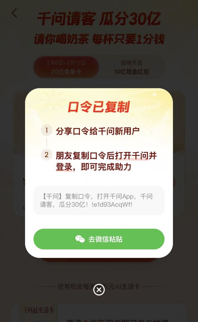 小编测试发现,目前在千问 APP 点击分享活动至微信时,已自动改为复制口令形式。