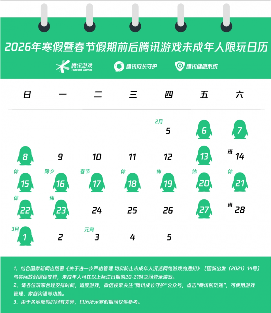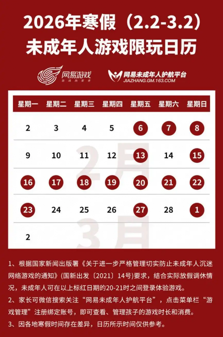 【TechWeb】2 月 6 日消息,网易游戏、腾讯游戏相继发布 2026 年寒假未成年人游戏限玩日历。