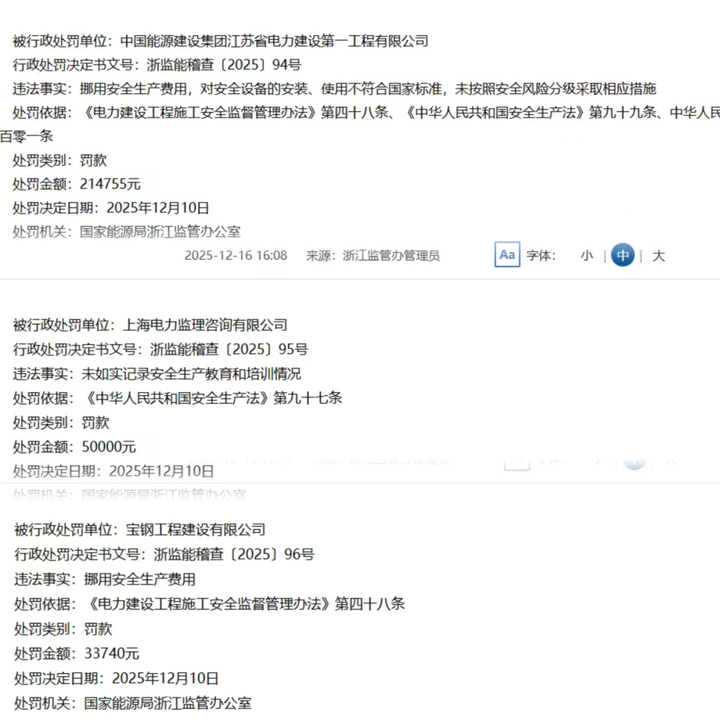 「挪用安全生产费用」——在国家能源局浙江监管办公室近期发布的行政处罚决定书中,这行字格外刺眼。宝钢工程建设有限公司因此被罚款 33740 元。而在同一批处罚名单中,上海电力监理咨询有限公司因 「未如实记录安全生产教育和培训情况」 被罚 5 万元。