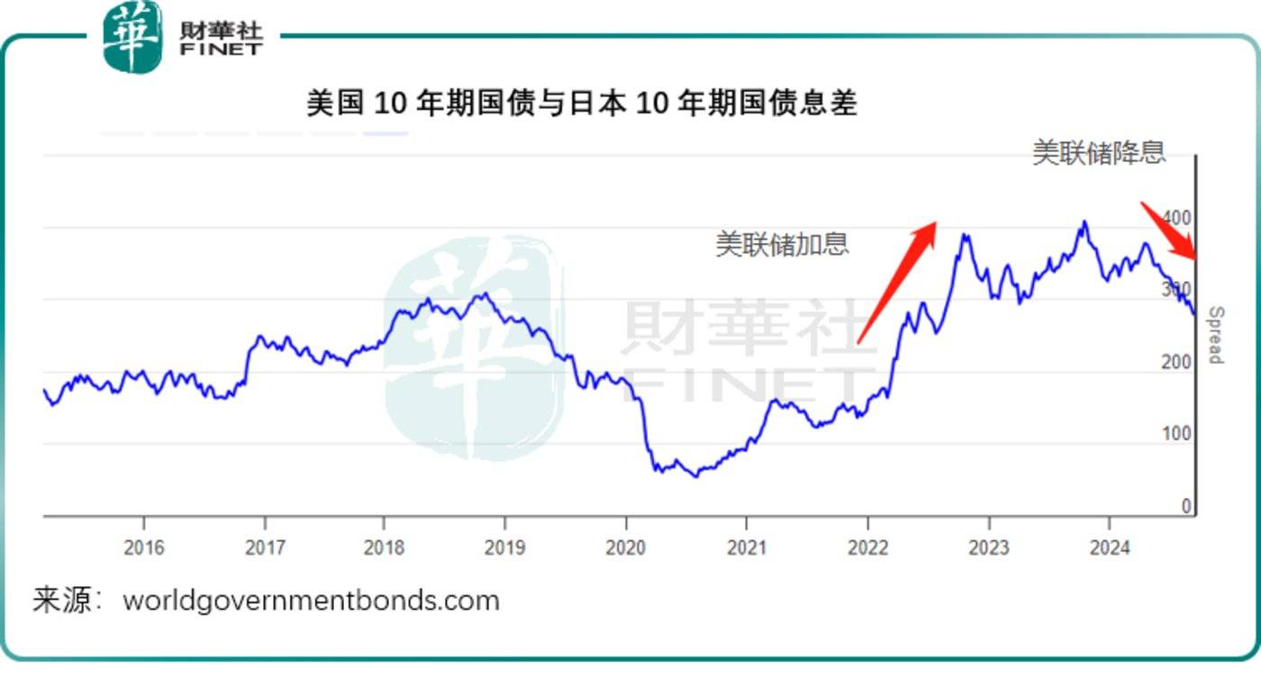 见下图,随着日本央行加息与美联储将降息的预期升温,日本 10 年期国库券与美国 10 年期国债息率之间的差额在下降。