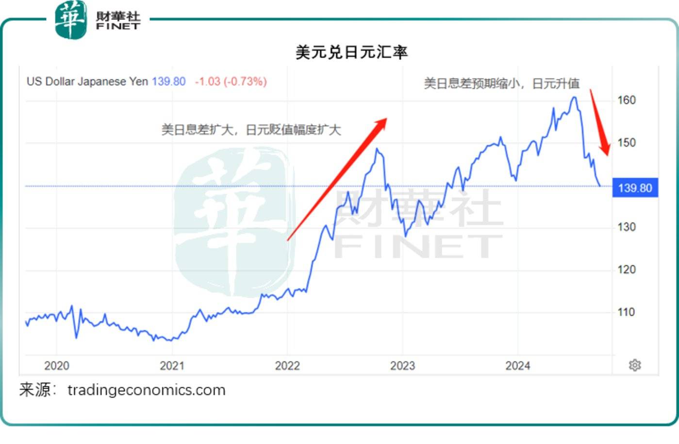 由于美国与日本之间的利率差有所缩小,日元兑美元的汇价也在上升。见下图为美元兑日元汇率曲线图,即曲线越往下,美元相对日元汇价下降,而日元相对美元汇价上升,反之亦然。而刚刚美元兑日元汇率已突破 140 的心理关口,这也是 2023 年 7 月以来的首次,反映日元近日的强势。