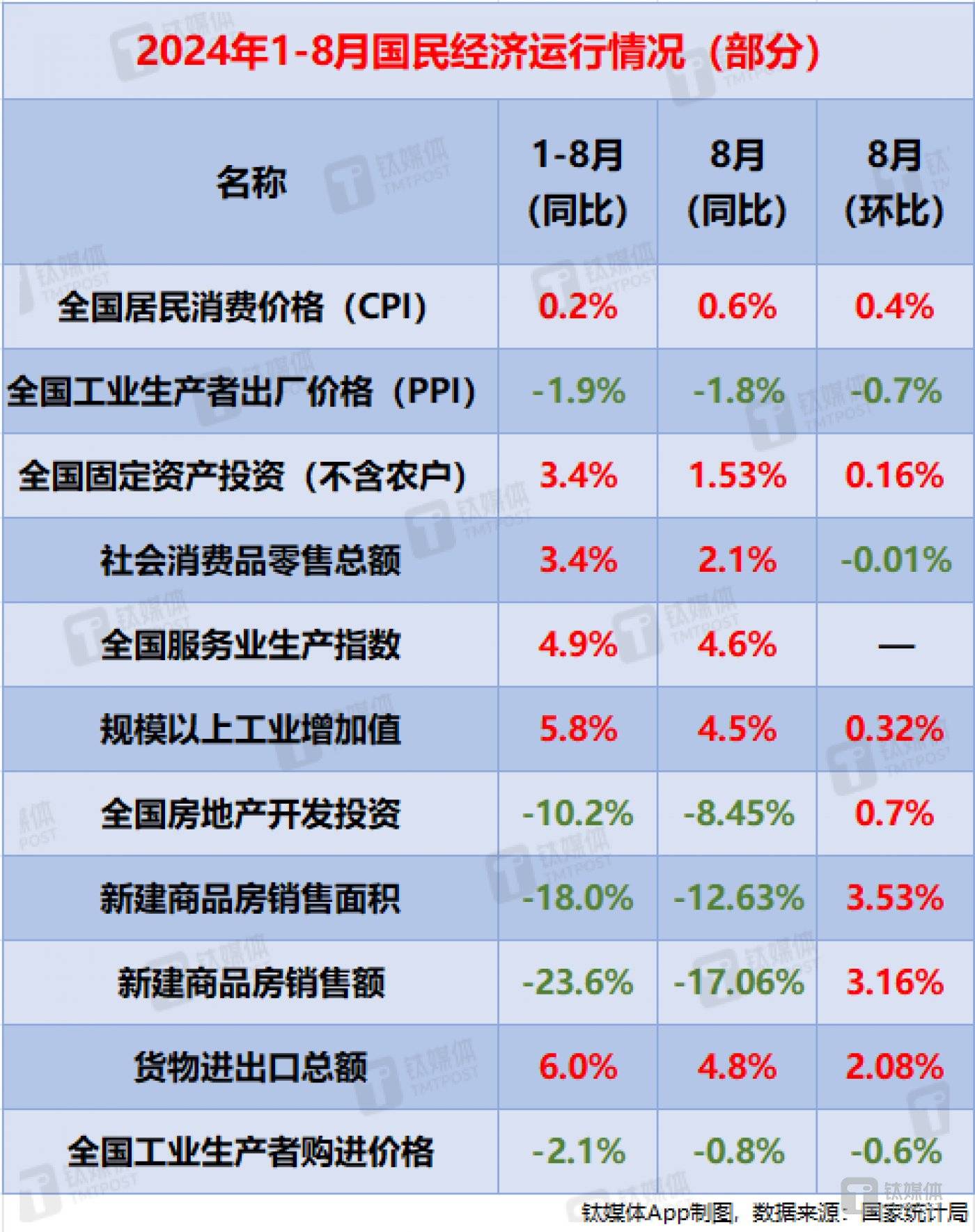 1-8 月国民经济运行情况一览:新建商品房销售额环比转涨,社零总额增速放缓至 3.4%